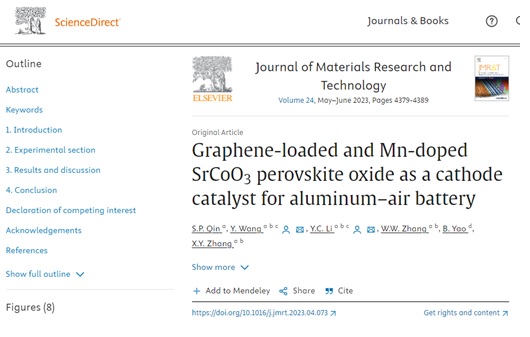 beat365官网2020级硕士研究生秦善鹏在国际期刊《Journal of Materials Research and Technology》(IF=6.40,SCI top期刊)上发表题为“Graphene-loaded and Mn-doped SrCoO3 perovskite oxide as a cathode catalyst for aluminum–air battery”的研究论文(DOI:https://doi.org/10.1016/j.jmrt.2023.04.073)。