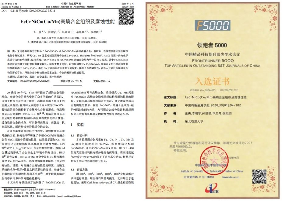 2.论文“FeCrNiCo(Cu/Mn)高熵合金组织及腐蚀性能”