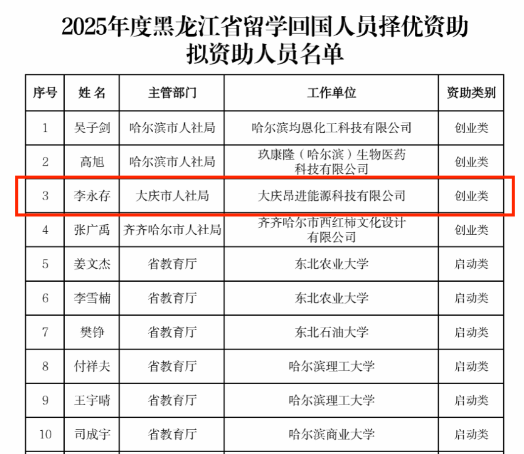 近日,黑龙江省人力资源和社会保障厅按照《关于开展2025年度黑龙江省留学回国人员择优资助工作的通知》(黑人社函〔2025〕450号)有关安排,对2025年度黑龙江省留学回国人员择优资助人员进行公示。beat365官网教师李永存入选本年度拟资助人员名单,本年度创业类全校仅有1人入选。