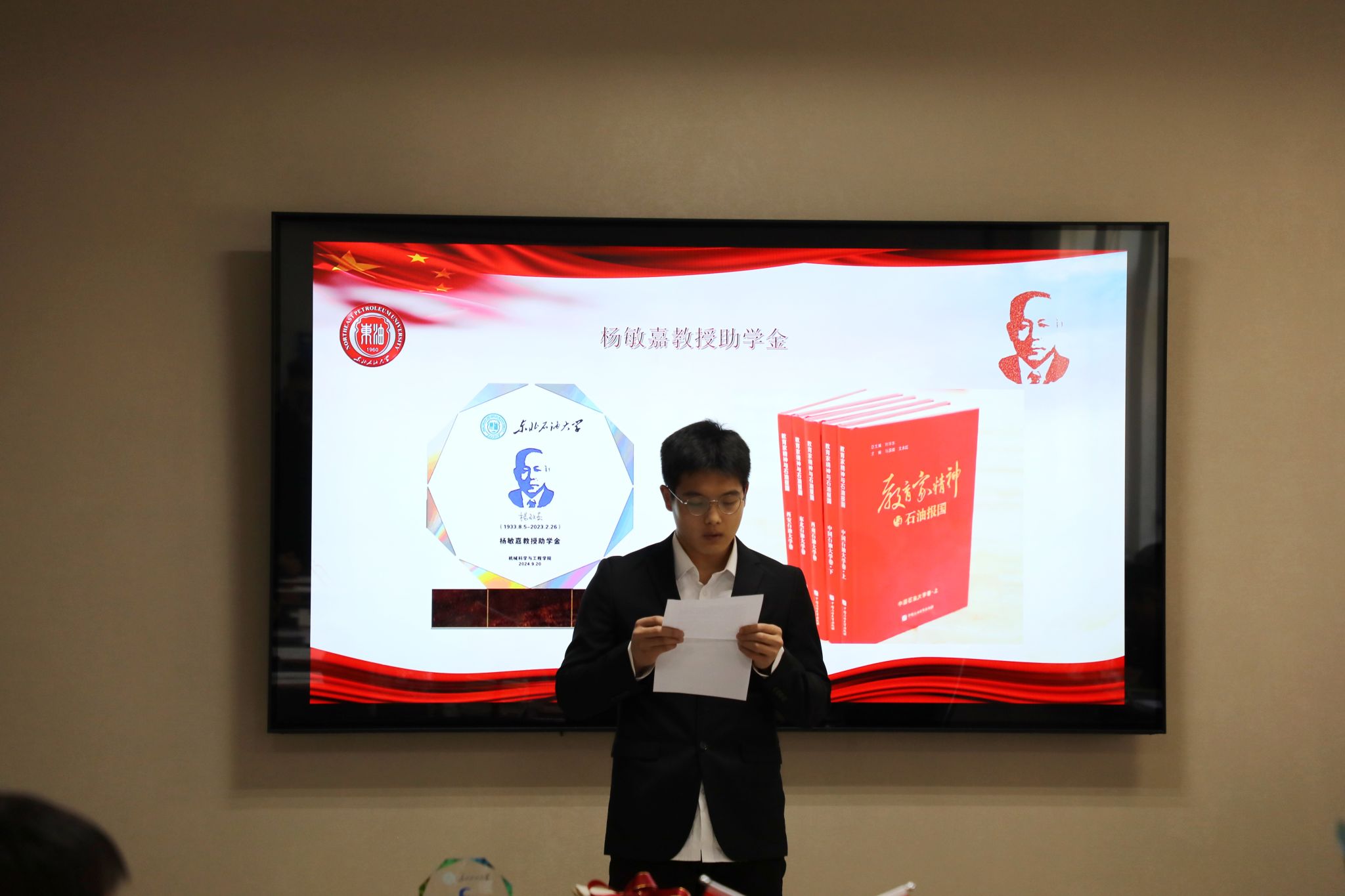 高洪峰代表学校,对杨敏嘉教授的卓越贡献致以崇高敬意和深切缅怀,对杨敏嘉教授家人的慷慨善举表示了诚挚的感谢,向获得资助的同学们表示祝贺,并就汇聚社会各界力量继续做大做强“杨敏嘉教授助学金”提出要求。他指出,杨敏嘉教授是“四有”好老师的模范带头人,是教书育人、培根铸魂的“大先生”,是为党育人、为国育才的教育家,他的事迹是对教育家精神的生动实践。作为东油筹建时期的首批拓荒者,为东油的建设奠基铺路,为机械学科建设发展呕心沥血,他留给我们的精神财富永远值得铭记和传承。“杨敏嘉教授助学金”捐赠颁奖仪式不仅仅是一场仪式,更是深刻的精神洗礼,希望受到资助的同学弘扬杨敏嘉教授精神,勇担历史重任,树牢能源报国之志,展现青年一代的担当与作为,为强国建设、民族复兴伟业贡献青春力量。