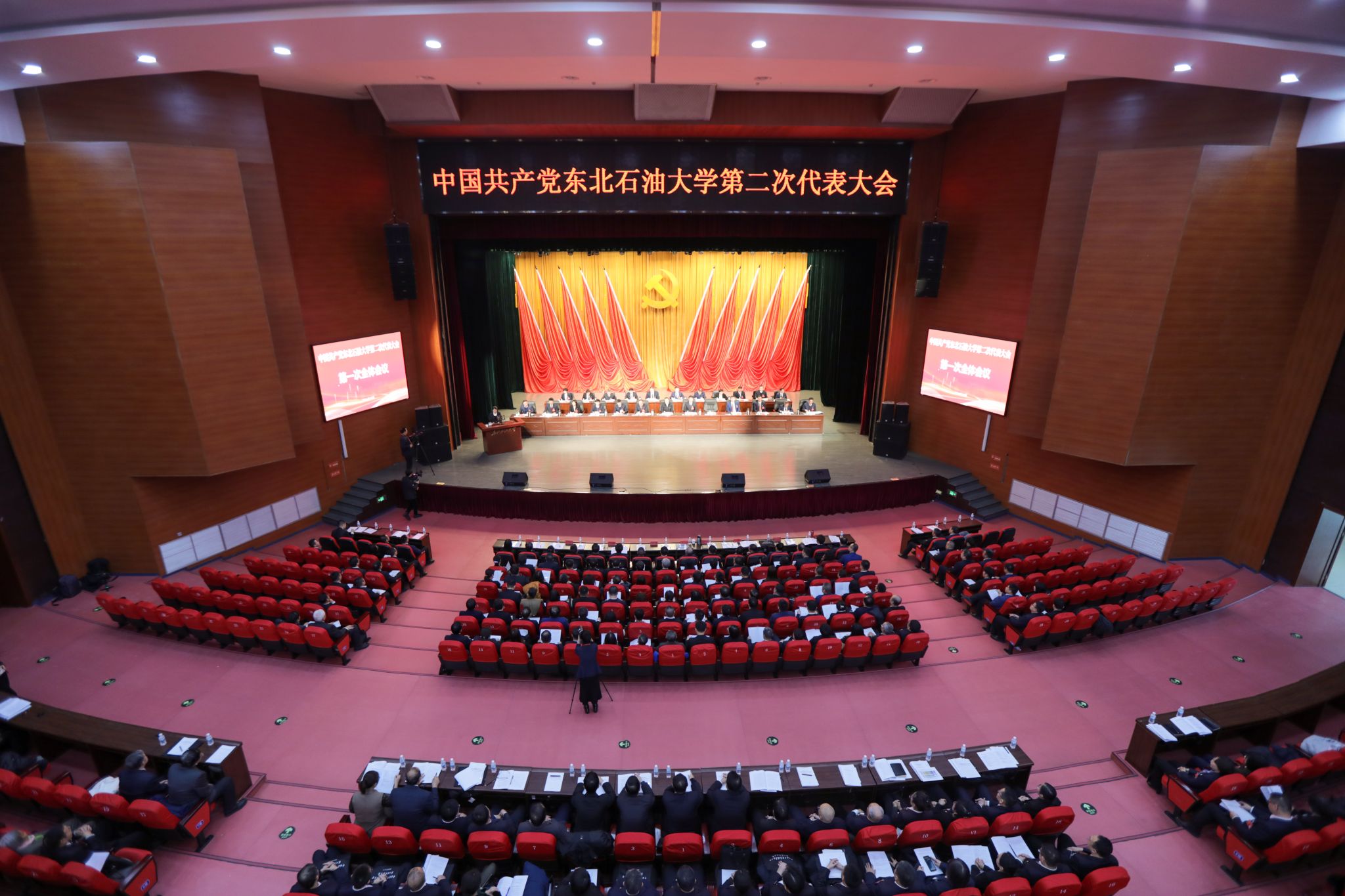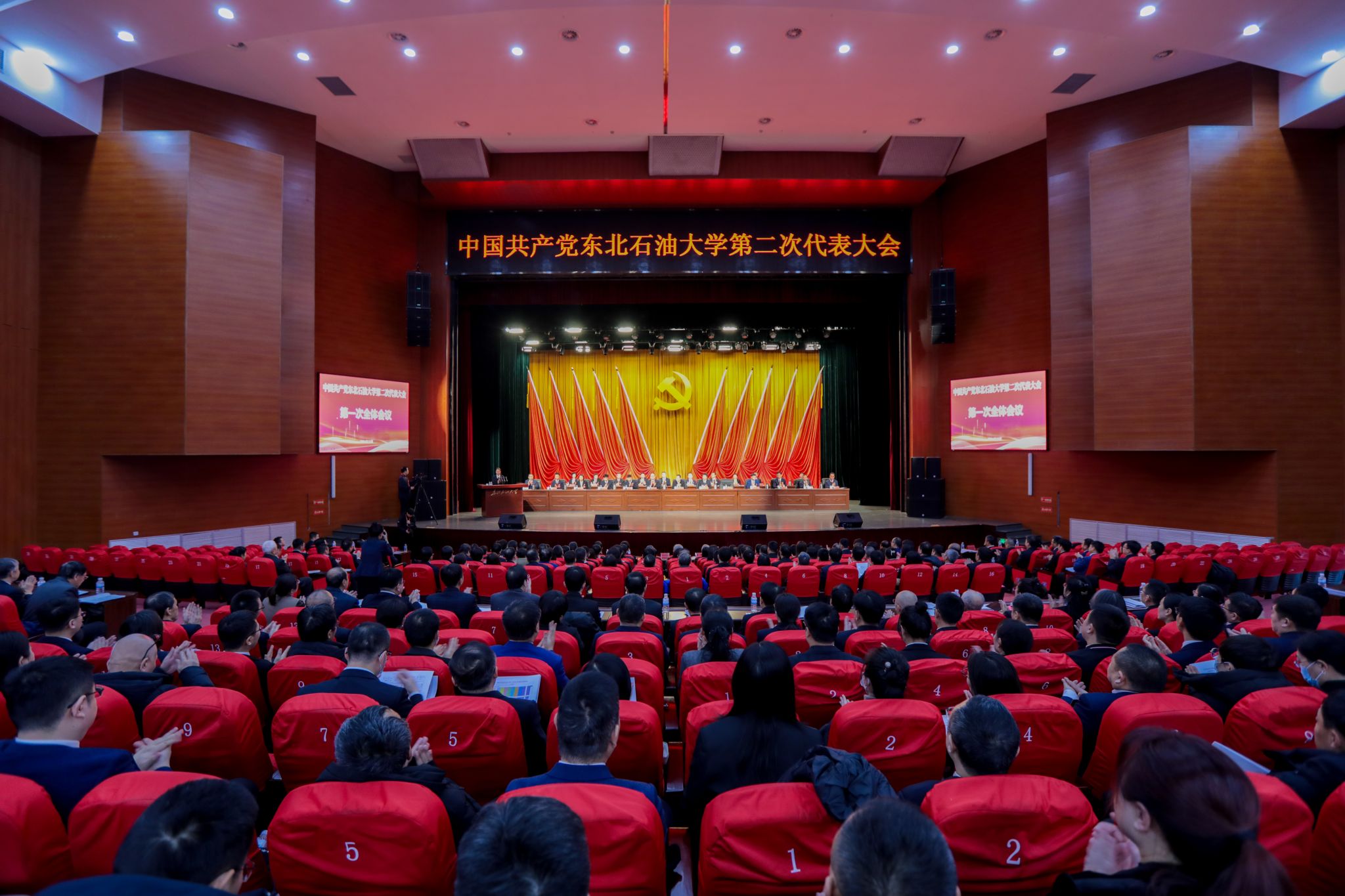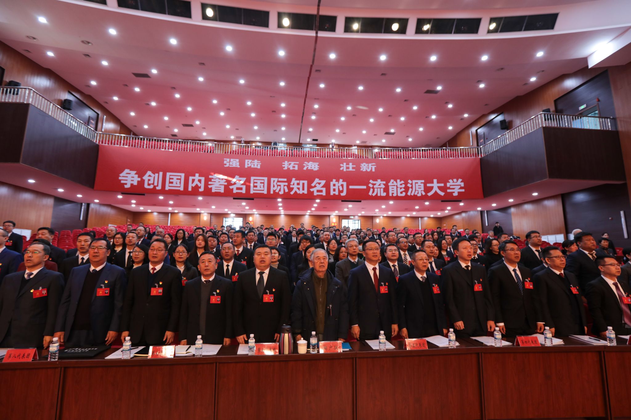 音乐厅气氛隆重热烈。主席台上方悬挂“中国共产党beat365正版唯一官网第二次代表大会”的会标。后幕正中,中国共产党党徽高悬,10面鲜艳的红旗分列两侧。音乐厅坐席上方悬挂“强陆、拓海、壮新,争创国内著名国际知名的一流能源大学”横幅。