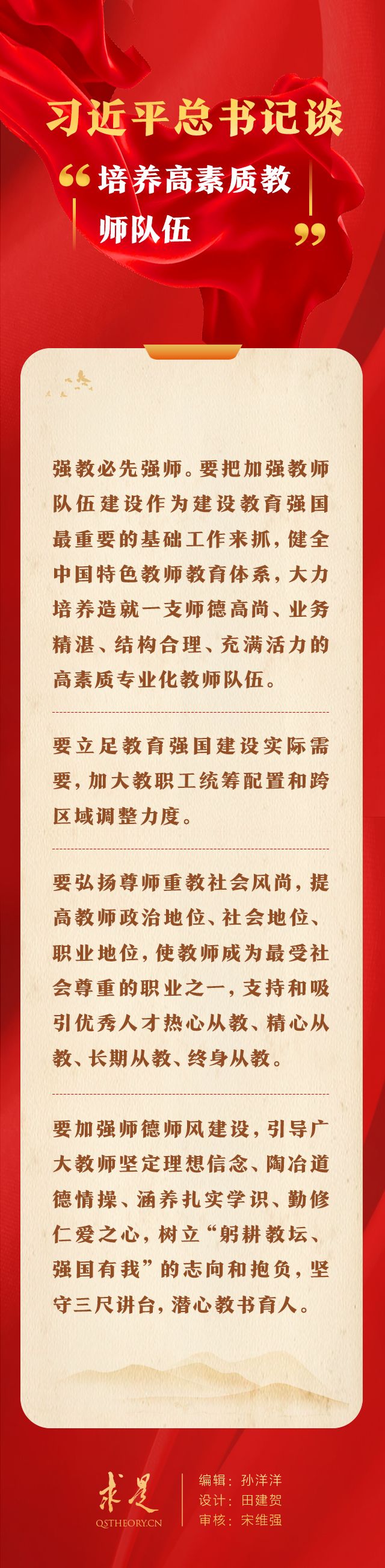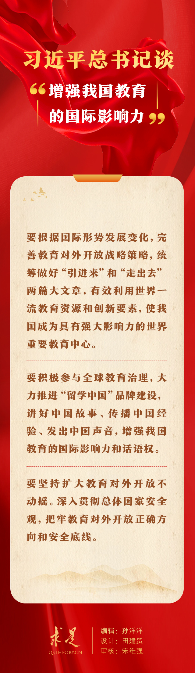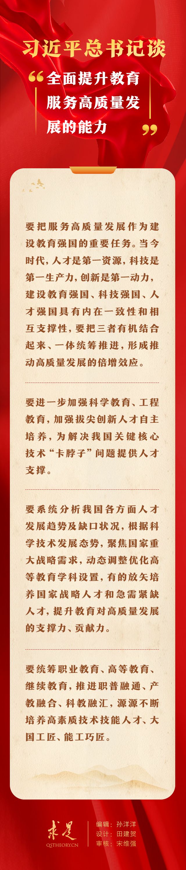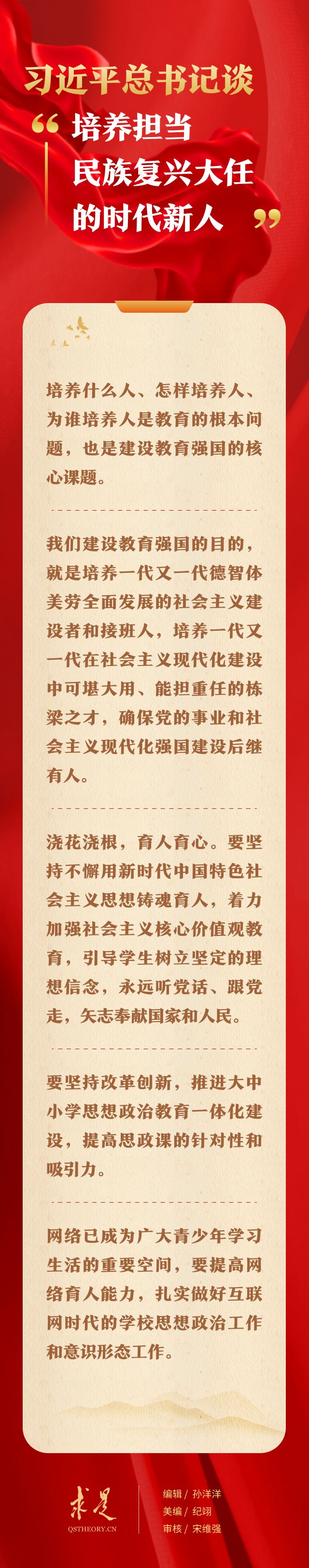 2023年9月16日出版的第18期《求是》杂志刊发习近平总书记重要文章《扎实推动教育强国建设》。在这篇重要文章中,总书记从“培养担当民族复兴大任的时代新人”、“加快建设高质量教育体系”、“全面提升教育服务高质量发展的能力”、“在深化改革创新中激发教育发展活力”、“增强我国教育的国际影响力”、“培养高素质教师队伍”6个方面,对扎实推动教育强国建设提出明确要求。