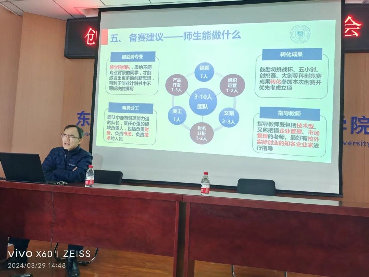 耿岱教授从双创政策解读、大赛变化解读、大赛激励解读、评委角度看大赛及精细备赛建议五个维度为大家做了详尽的专题培训,通过大赛的组织、准备及参赛各个环节的关键因素出发,深入浅出了阐述了大学生创新大赛与教学科研的关系,充分阐述和分析了大赛中体现的专创融合、产教融合、思创融合思想。