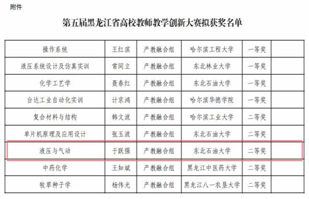 依托在大庆普罗石油科技公司开展的《液压与气动》实践课程环节以及录课视频,beat365官网于跃强副教授代表beat365正版唯一官网参加了第五届全国高校教师教学创新大赛(黑龙江赛区)产教融合赛道竞赛,成功进入黑龙江赛区现场决赛并斩获二等奖,为校企双方共同探索打造课程建设、课堂教学改革等产教融合建设增添了标志性成果。