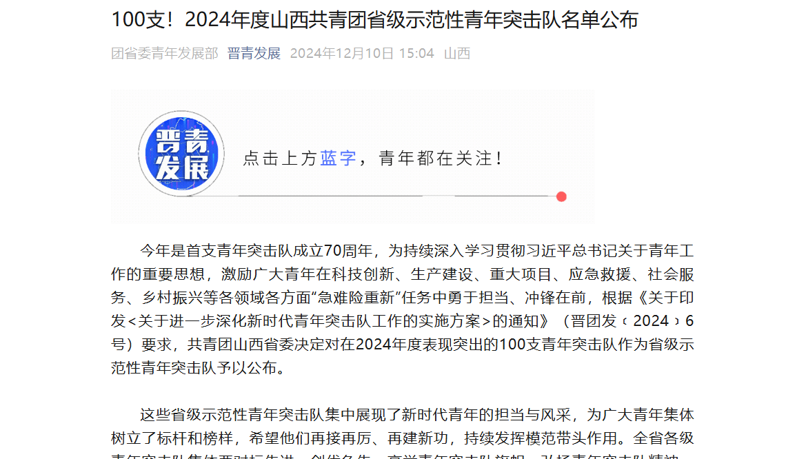 今年是首支青年突击队成立70周年,为持续深入学习贯彻习近平总书记关于青年工作的重要思想,激励广大青年在科技创新、生产建设、重大项目、应急救援、社会服务、乡村振兴等各领域各方面“急难险重新”任务中勇于担当、冲锋在前,根据《关于印发<关于进一步深化新时代青年突击队工作的实施方案>的通知》(晋团发﹝2024﹞6号)要求,共青团山西省委决定对在2024年度表现突出的100支青年突击队作为省级示范性青年突击队予以公布。